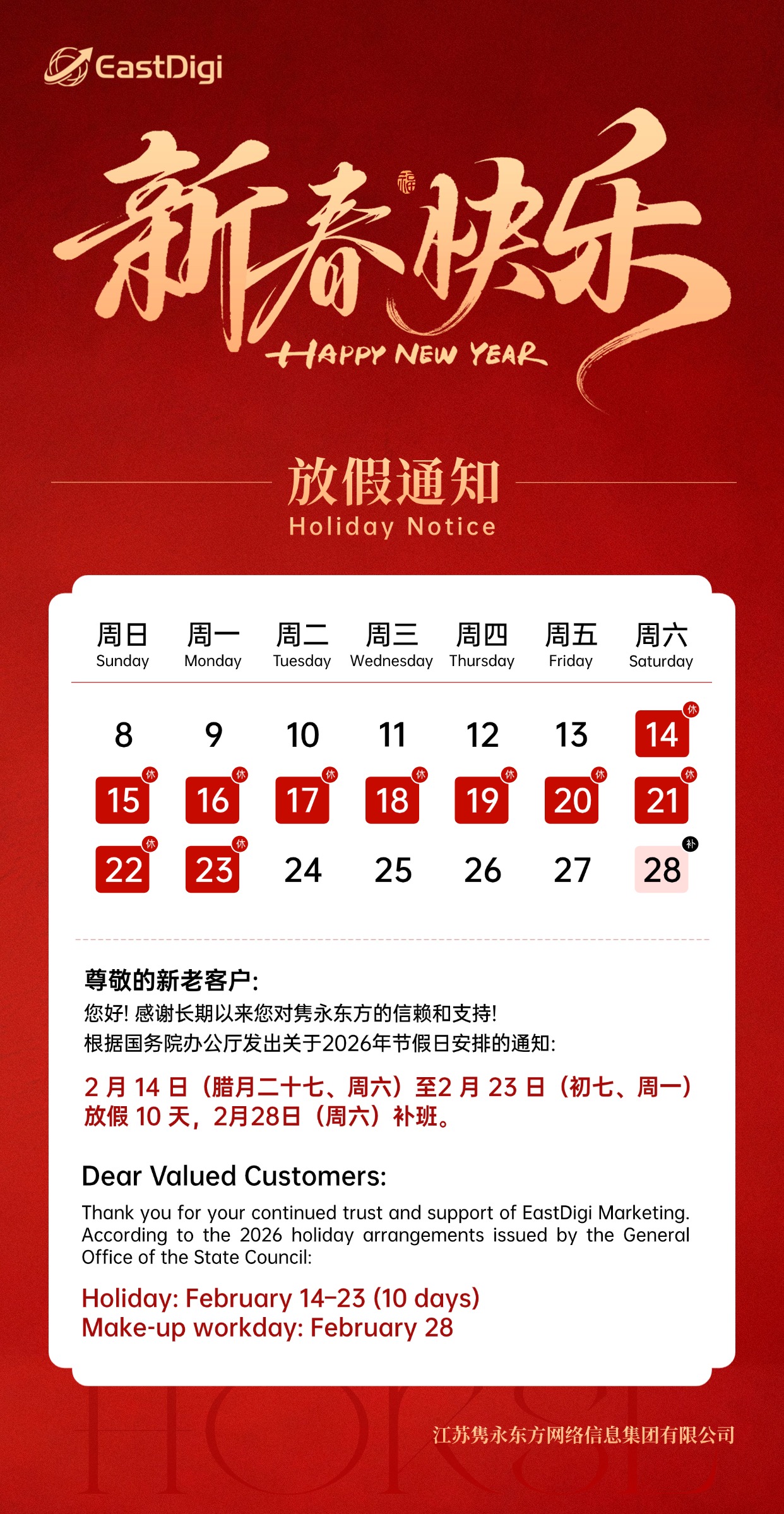 Thank you for your continued trust and support of EastDigi Marketing. According to the 2026 holiday arrangements issued by the General Office of the State Council: