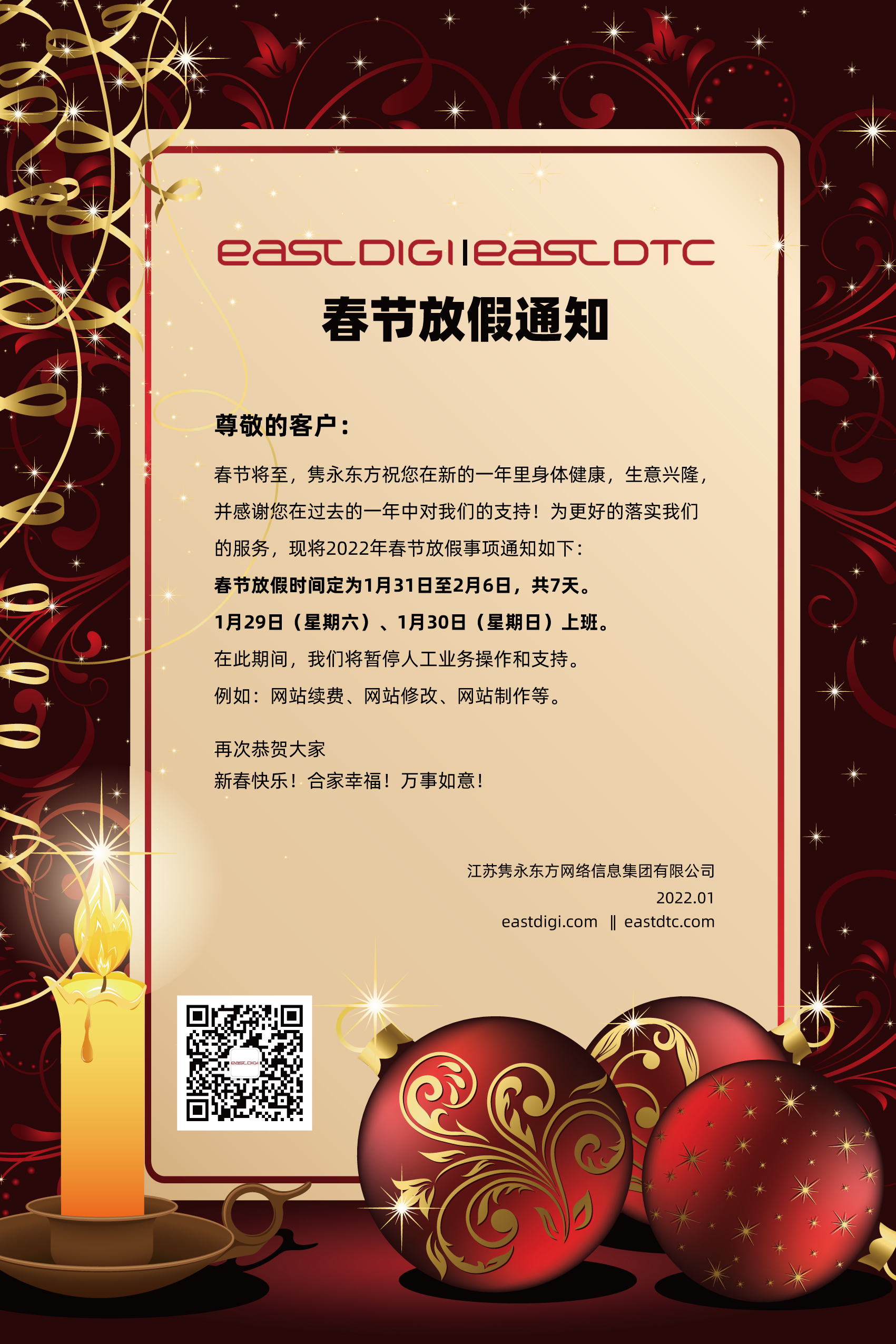 春节将至,隽永东方祝您在新的一年里身体健康,生意兴隆,并感谢您在过去的一年中对我们的支持!为更好的落实我们的服务,现将2022年春节放假事项通知如下: